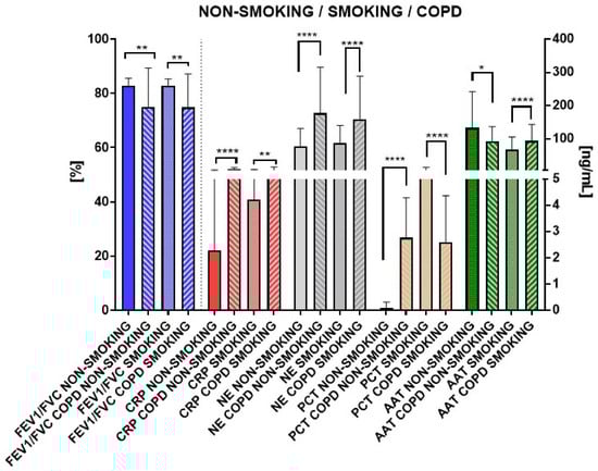 Moving forward, CRP, NE, and PCT levels were notably (**** p < 0.0001) increased in non-smoking COPD patients compared to the non-smoking cohort, while AAT demonstrated a decreased pattern (* p < 0.5). In smoking COPD patients, CRP (** p = 0.047), NE (**** p < 0.0001), and AAT (**** p < 0.0001) showed higher levels than those addicted to tobacco with a general good condition. Conversely, PCT levels were much lower in COPD saliva compared to smokers. However, PCT levels in non-smoking and smoking COPD groups were on a similar level.