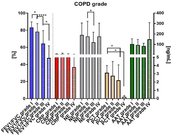 CRP followed a similar trend with decreasing concentrations in subsequent grades; however, the differences were not notable. NE and AAT displayed lower levels in grade II compared to I and lower levels in grade III compared to II, but higher levels in grade IV compared to III. PCT exhibited lower levels in subsequent grade subgroups, with a significant (* p = 0.04) difference observed in grades III and IV compared to the grade I group.
