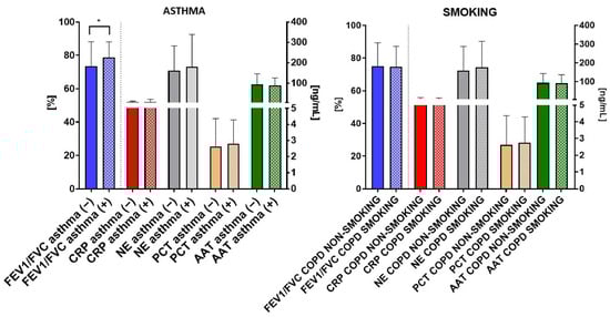 Finally, we conducted a comparison between individuals with and without asthma as a co-existing disease, revealing that patients with asthma exhibited a higher FEV1/FVC ratio compared to COPD patients without asthma (* p = 0.04; Figure 8). However, no significant differences were observed in the remaining parameters. Additionally, grouping COPD patients based on smoking and non-smoking status did not reveal any significant differences within the COPD group at a molecular level.