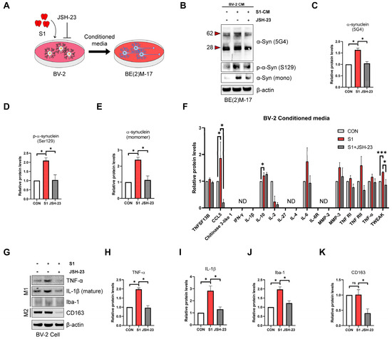 Pro-inflammatory cytokines secreted by microglia are strongly implicated in the mechanisms of α-Syn aggregation [27,44]. Furthermore, we observe in Figure 1E that histological analysis of the SNpc region of the brain from S1-treated rats showed activated microglia surrounding the syn aggregate signal. Therefore, to identify whether S1 affected aggregation of α-Syn via a pro-inflammatory response induced by microglia activation, conditioned media (CM) from BV-2 microglial cells were used to treat the BE(2)M-17 dopaminergic neuronal cell line. To verify whether the change in BE(2)M-17 via CM of BV-2 was due to an inflammatory response, we used JSH-23, an NF-kB inhibitor, which is a typical inflammatory regulator. The study design is shown in Figure 2A.