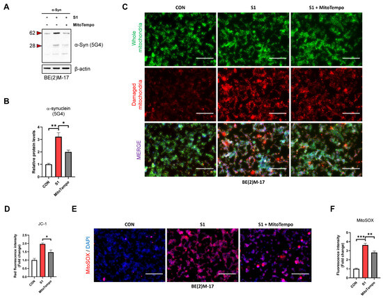 To determine whether S1 directly affects dopaminergic neurons, we treated BE(2)M-17 cells with S1. The aggregated form of α-Syn (5G4) and monomeric α-Syn was not altered by S1; however, p-α-Syn (Ser129) was significantly increased by S1 (Supplementary Figure S1B–E). It is well established that Ser129 phosphorylation of α-Syn increases α-Syn aggregation [46]. Thus, this result suggests that when S1 acts independently on neurons, it has the potential to increase α-Syn aggregation, but this effect may occur only if sufficient α-Syn is accumulated. Therefore, we aimed to observe the direct effects of S1 in BE(2)M-17 overexpressing α-Syn. Several studies have reported that S1 increases mitochondrial ROS levels and damage [29,47]. Also, mitochondrial damage is associated with the aggregation of α-Syn [48]. We therefore used MitoTempo, a mitochondria-specific ROS scavenger, to verify whether S1 directly promotes aggregation of α-Syn in BE(2)M-17 via mitochondrial ROS production.