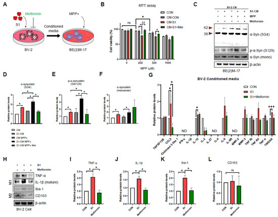 SARS-CoV-2 S1-induced microglial activation enhances MPP-induced cytotoxicity and α-Syn aggregation, with the moderating effects of metformin. (A) A schematic diagram showing BE(2)M-17 dopaminergic neuron cells stimulated by S1 protein-activated BV-2-conditioned media (CM). BV-2 cells were incubated for 24 h in serum-free DMEM (untreated controls) or serum-free DMEM containing S1 (200 ng/mL), with or without 1 mM metformin. BE(2)M-17 cells were treated with collected BV-2 CM with or without MPP+ for 24 h. Further details are provided in Section 2. (B) The effects of MPP+, 200 ng/mL S1-activated BV-2 CM, and metformin (alone and in combination) on the cell viability (% of control) of BE(2)M-17 cells for 24 h. (C) Representative images of immunoblot analysis using specific antibodies for aggregated α-Syn (5G4), phospho-α-Syn (Ser129), and monomeric α-Syn. (D–F) Quantification of immunoblot analysis for aggregated α-Syn (5G4), phospho-α-Syn (Ser129), and monomeric α-Syn. (G) Multiplex cytokine analysis from conditioned media of BV-2 cells in response to S1 (200 ng/mL) with or without 1 mM metformin. (H) Representative images of immunoblot analysis using specific antibodies for TNF-α, mature IL-1β, Iba-1, and CD163. (I–L) Quantification of immunoblot analysis for TNF-α, mature IL-1β, Iba-1, and CD163. All data are presented as mean ± standard error of the mean (n = 3–5 per group, * p < 0.05, ** p < 0.01, and *** p < 0.001, ND; Not Detected, ns; no significance).