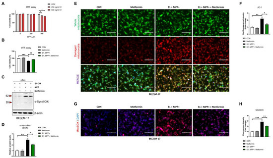 To determine whether S1 has a direct synergistic effect with MPP+ in dopaminergic neurons, we used BE(2)M-17 cells overexpressing α-Syn. The MTT assay confirmed that 500 ng/mL S1 with 500 μM MPP+ significantly reduced cell viability, compared to either treatment alone (Figure 5A), and that metformin ameliorated these effects (Figure 5B); thus, we continued to observe the moderating effect of metformin on the S1-induced aggregation of α-Syn under this condition. The aggregated form of α-Syn (5G4) was increased by S1 with MPP+ compared to that with MPP+ alone (Figure 5C,D). Mitochondrial damage was detected using JC-1 dye, and the number of damaged mitochondria (red) was increased by S1 and MPP+ treatment compared to the control group (Figure 5E,F). In addition, image analysis of mitochondrial ROS using MitoSOX confirmed that the signal was increased by S1 and MPP+ treatment compared to the control (Figure 5G,H). Finally, we observed that metformin reversed all changes induced by S1 with MPP+ treatment. In summary, combined with Figure 4, we clearly demonstrated that S1 and the neurotoxin MPP+ have a synergistic effect on cytotoxicity and aggregation of α-Syn, and that metformin attenuates these effects.