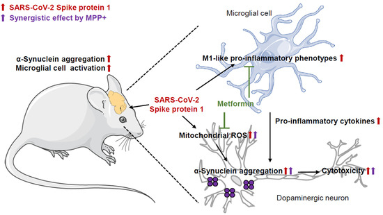 This study aimed to investigate if S1 induces α-synucleinopathy and examine the mechanisms involved both in vivo and in vitro. It is the first to show that intranasal administration of S1 increases the aggregation of α-Syn in the brain of a rodent model. In vitro, we showed that S1 induced a pro-inflammatory response in BV-2 microglial cells and mitochondrial ROS production in BE(2)M-17 dopaminergic neurons, leading to the aggregation of α-Syn. Furthermore, building on previous findings, we showed the synergistic effects of MPP+, an environmental neurotoxin implicated in PD; the aggregation of α-Syn; and the therapeutic effects of metformin used as an anti-inflammatory and anti-mitochondrial damage agent.