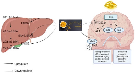 An in vivo study from Wu et al. (2014) investigated the combined effects of curcumin- and/or DHA-enriched diets (DHA, 1.2%; Cur, 500 ppm) for 2 weeks in rats with post traumatic brain injury []. In cognitive tests performed in a Barnes maze, groups receiving the combination displayed even greater beneficial effects in learning performance than separate applications. The combination showed greater effects in restoring BDNF and phosphorylated-tropomyosin receptor kinase B (p-TrKB) expressions, both critical biomarkers for neuronal survival and growth. The mechanisms underpinning the enhanced effects of the combination were also associated with preserved DHA in the plasma membrane and reduced lipid peroxidation when curcumin was added. Moreover, curcumin was observed to intersect with DHA pathways in the brain, leading to a reduction in the metabolism of DHA []. This finding is supported by Wu et al. (2015), in which curcumin increased DHA synthesis from its precursor, alpha-linolenic acid (ALA), by elevating fatty acid desaturase 2 (FADS2) and elongase (Elov) 2 via the fatty acid desaturase 2 (FASD2)-dependent pathway []. Interestingly, another study conducted by Sharman et al. (2019) suggested that adding curcumin (0.59 g/kg) to a mixture of DHA (0.36 g/kg), ALA (1 g/kg), and EGCG (0.36 g/kg) did not result in extra benefits in potentiating neuroinflammation and neuroprotective effects compared to the mixture alone in male Tg2576 transgenic mice []. The findings from preclinical investigations combining curcumin with FO/DHA appear to be preliminary, possibly due to variations in the study designs and dosages used. A diagram for the proposed interaction between curcumin and the DHA metabolism pathway is shown in Figure 2.