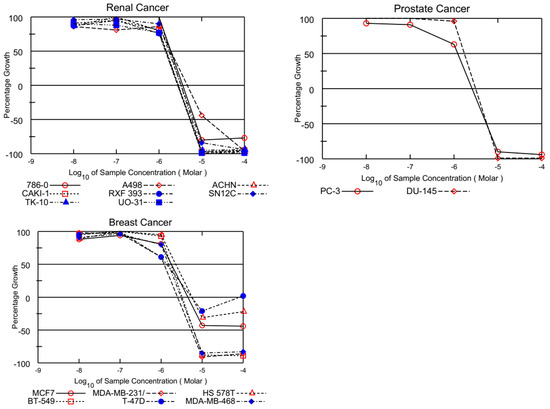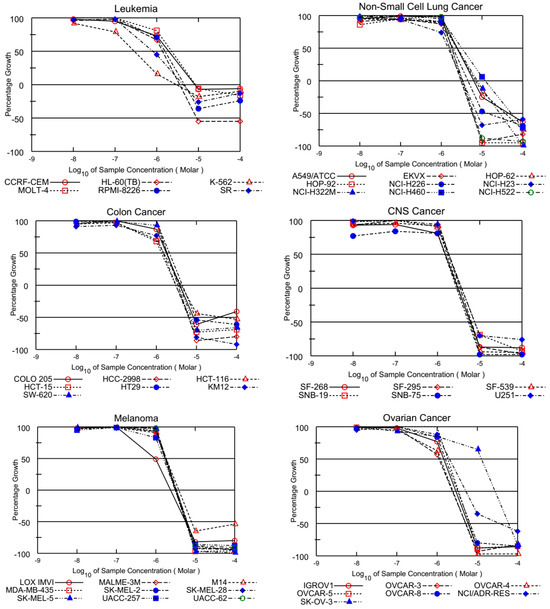 The obtained quinolinequinones were submitted to NCI, Bethesda, USA, and, as per standard protocol of NCI, all compounds were evaluated for their antiproliferative activity at single-dose assay (10 µM concentration in DMSO) on a panel of 60 cancer cell lines derived from leukemia, non-small-cell lung, colon, CNS, melanoma, ovarian, renal, prostate, and breast, as per protocol. Tested compounds were added to the microtiter culture plates followed by incubation for 48 h at 37 °C. Sulforhodamine B (SRB), a protein-binding dye, is used for endpoint determination. The percent of the growth of the treated cells was determined in comparison to the untreated control cells and the results of each tested compound were reported. Data from one-dose experiments pertain to the percentage growth at 10 μM [16,17,18].