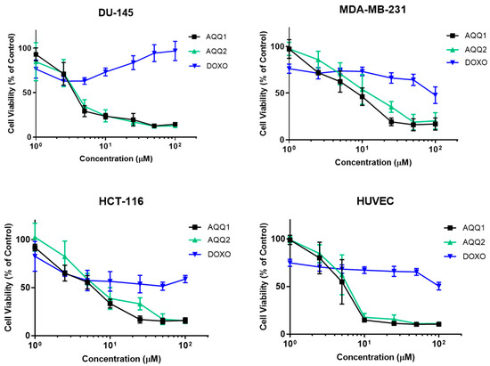 In this section, the effects of AQQ1 and AQQ2 were evaluated alongside Doxorubicin HCl (DOXO) (a well-established chemotherapeutic agent) across versatile cell lines: DU-145, MDA-MB-231, HCT-116, and Human Umbilical Vein Endothelial Cells (HUVEC). Comparing the cell lines, it is evident that they displayed varying sensitivities to the tested substances (Figure 3).