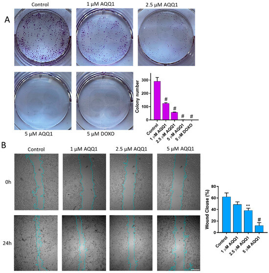 Representative images with quantitative analyses of colony formation (A) and scratch assays (B) in DU-145 cells following AQQ1 treatment. # p < 0.0001, ** p < 0.01. Scale bar = 100 μm, n = 3.