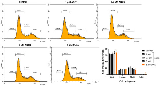 Representative images along with quantitative analysis of cell cycle distribution in DU-145 cells following AQQ1 treatment. Values expressed as mean ± SEM. ** p < 0.01, * p < 0.05, n = 4.