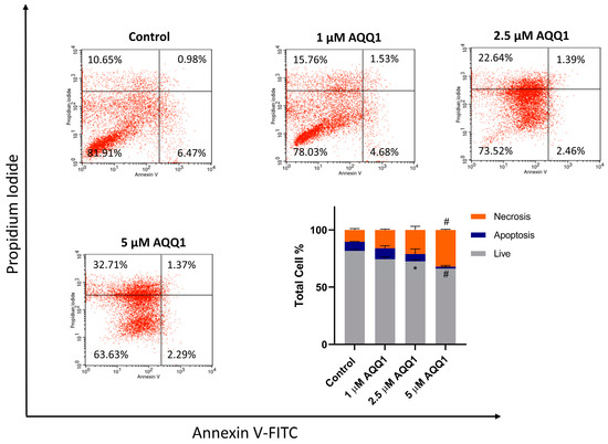 Representative images from flow cytometric apoptosis/necrosis assay, along with quantitative analysis for DU-145 cells treated with AQQ1. Values expressed as mean ± SEM. # p < 0.0001, * p < 0.05, n = 3.