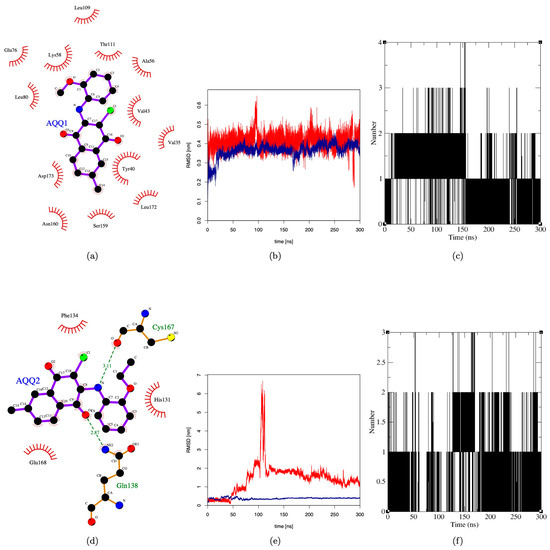 Molecular dynamics simulation of AQQ1 and AQQ2 against MAPK. (a,d) Two-dimensional interaction plot of AQQ1 and AQQ2 with MAPK; (b,e) RMSD plot of AQQ1 and AQQ2 for duration of 300 ns; and (c,f) H-bond plot of AQQ1 and AQQ2 for duration of 300 ns.