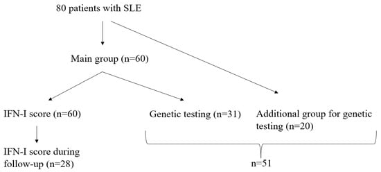 The diagnosis of SLE was established according to Systemic Lupus International Collaborating Clinics (SLICC) 2012 criteria [16]. The design of the study is in Figure 1. We evaluated the IFN-I score in 60 patients (main group). The additional group (n = 20) included patients with only the results of a genetic test without IFN-I assessment. The majority of the patients were White/Caucasians (n = 66, 82.5%), and the remaining 14 (17.5%) patients were Sakha ethnicity (the big Asian population in our country).