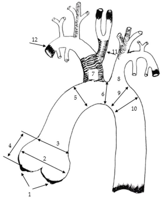The scheme of branching of the main arteries in pigs. 1—aortic valve annulus fibrosus (AoVAnF), 2—sinus of Valsalva (SVal), 3—sinotubular junction (StJ), 4—aortic root height (Ao root height), 5—ascending aorta (Asc Ao), 6—proximal portion of the aortic arch (ProxAo arch), 7—brachiocephalic trunk (BrachTr), 8—left subclavian artery (LSubclAa), 9—distal portion of the aortic arch (DistAo arch), 10—aortic isthmus (Ao Ist), 11—common carotid artery, 12—right subclavian artery.