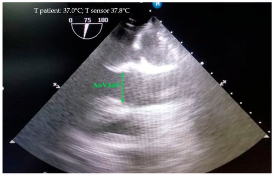 Echocardiography was performed in accordance with the methods especially designed for animals [17,18] on a Philips CX-50 ultrasound machine (Revision 3.1.2) with an X7-2t transesophageal sensor. The structures of the aortas were evaluated from the fibrous ring of the aortic valve to the ascending part of the aortic arch. The structures of the aorta below were either not visible at all or were difficult to distinguish by echocardiography. Therefore, the size of the aorta below the distal arch was estimated by angiography. The fibrous ring of the aorta was measured at its maximum ring size during systole, with the cursor placed from one inner edge to the inner edge where the flaps attach (Figure 2).