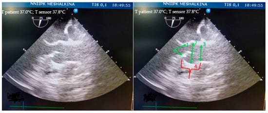 Visualization of the aortic root in mini pigs on TEE: 1—fibrous ring of the aortic valve; 2—sinus of Valsalva; 3—sinotubular junction; 4—height of the aortic root.