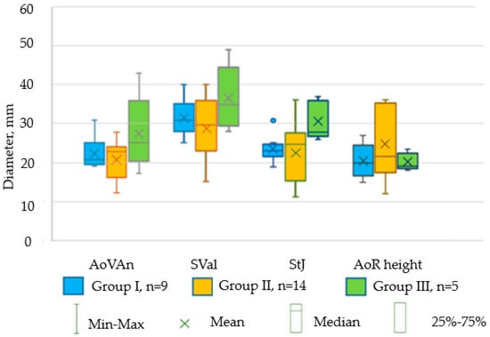 The main parameters of the aortic root in mini pigs in groups of 40–70 kg (Group I, n = 9), 71–90 kg (Group II, n = 14), and more than 90 kg (Group III, n = 5)). AoVAn—diameter of the fibrous ring of the aorta according to TEE; SVal—sinus Valsalva according to TEE; StJ—sinotubular junction according to TEE; AoR height—height of the aortic root according to TEE. Along the x-axis, there are the main structures of the aortic root; the y-axis shows the size of the diameter in mm. No significant differences in the size of aortic valve annulus fibrosus, sinus of Valsalva, sinotubular junction, and aortic root height were found in all three groups (p > 0.999 in the K–W test).