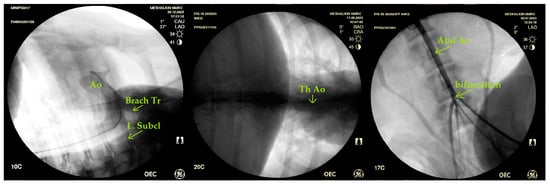 Visualization of the aorta in its various sections by angiography: Ao—aorta; Brach. Tr.—brachiocephalic trunk; L. Subcl.—left subclavian artery; bifurcation- bifurcation; Abd.Ao—abdominal aorta; Tr Ao—thoracic aorta.