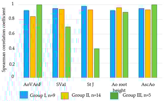 Spearman correlation’s rank order between the results obtained by echocardiography and angiography; the noted correlations are significant at p < 0.05. Along the x-axis, the main structures of the aortic root are given; the y-axis shows the value of the Spearman correlation coefficient.