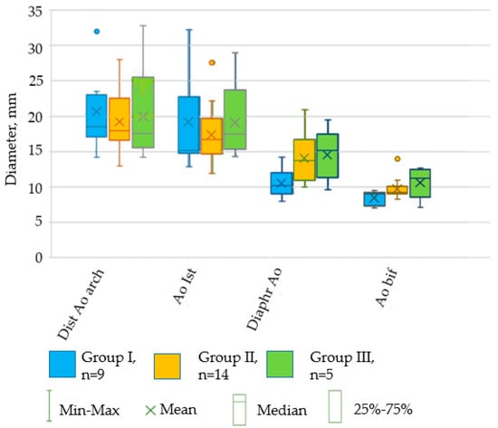 The change in the diameter of the aorta (mm) from the distal part of the aortic arch to the bifurcation in the abdominal region. Dist Ao arch—distal portion of aortic arch; Ao Ist—aortic isthmus; Diaphr Ao—diaphfragmatic part of the aorta; Ao bif—aortic bifurcation. There were no significant differences between the groups in the size of the aortic diameter at these measurement points (p = 1 in the K–W test). The measurement points of the aorta are plotted along the x-axis; the y-axis shows the size of the diameter in mm.