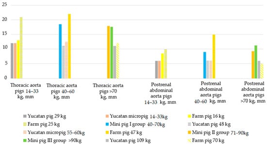 The change in the diameter of the thoracic and abdominal aortas in mini pigs of different weights compared to pigs of other breeds (Swindle M.M. et al., 2016 [26]). The measurement points of the aortas are plotted along the x-axis; the y-axis shows the size of the diameter in mm.