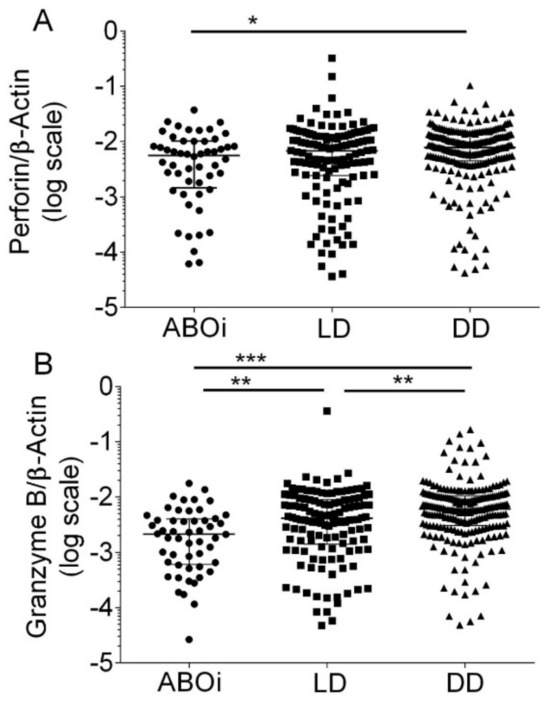 Scatter diagram of Perforin transcripts (A) and Granzyme B transcripts (B) in peripheral blood mononuclear leukocytes from 408 recipients 8 days after incident kidney transplantation. A total of 52 recipients had blood group AB0-incompatible living donor allografts (ABOi), 130 recipients had ABO-compatible living donor allografts (LD), and 226 recipients had deceased donor allografts (DD). Median values and interquartile range (IQR) are indicated. Differences between groups were analyzed with the Kruskal–Wallis test and Dunn’s multiple comparisons test, * p < 0.05; ** p < 0.01; *** p < 0.001).