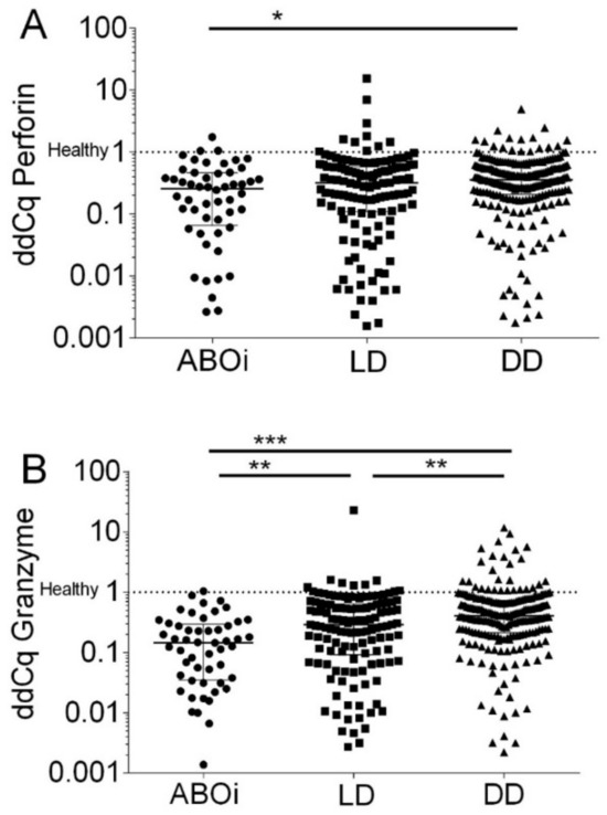 When quantifying transcripts according to the ddCq method, we observed that ABOi had a median of 14.5% (IQR, 3.5% to 29.6%) Granzyme B transcripts of healthy subjects, LD had 29.0% (IQR, 9.2% to 64.4%) Granzyme B transcripts of healthy subjects, and DD had 40.7% (IQR, 21.4% to 73.0%) Granzyme B transcripts of healthy subjects, respectively (p < 0.0001 by the Kruskal–Wallis test; Figure 4B).