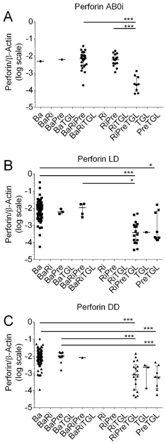 In LD, Perforin transcripts were significantly lower in recipients who obtained PreTGL compared to Ba (p < 0.05), RiPreTGL compared to Ba (p < 0.001), and RiPreTGL compared to BaRiTGL (p < 0.05 by the Kruskal–Wallis test and Dunn’s multiple comparisons test).