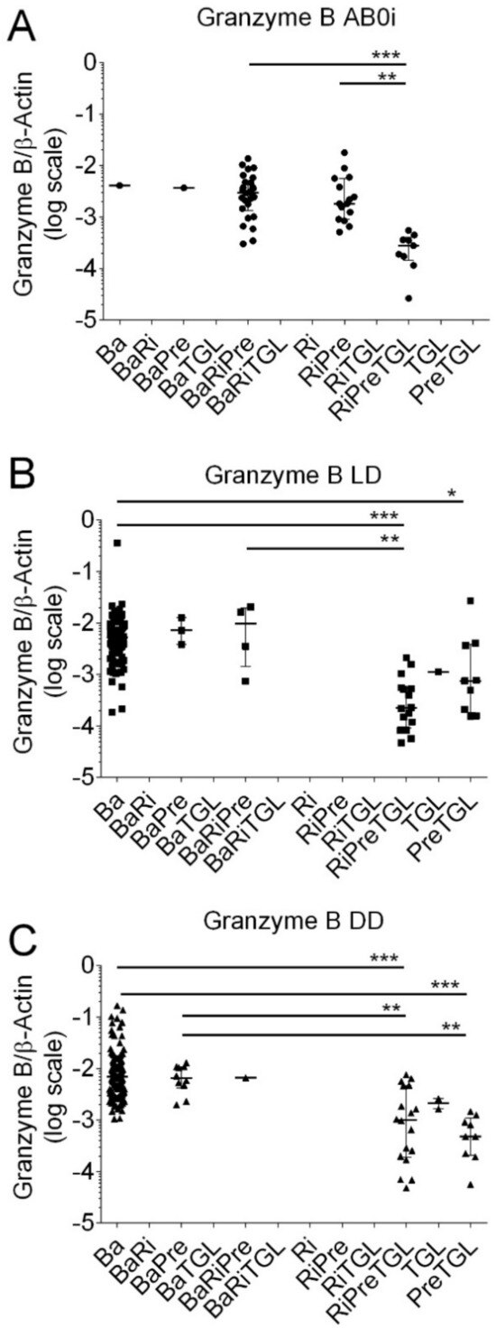 In LD, Granzyme B transcripts were significantly lower in recipients who obtained PreTGL compared to Ba (p < 0.05), RiPreTGL compared to Ba (p < 0.001), and RiPreTGL compared to BaRiTGL (p < 0.01 by the Kruskal–Wallis test and Dunn’s multiple comparisons test).
