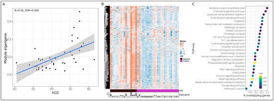 Co-methylation network identified in BAL cells was associated with age and HIV. (A) Linear relationship between age and the red module co-methylation network eigengene is represented by the blue line with the grey area representing the 95% confidence interval for the linear relationship); black dots represent the module eigengene and chronological age values for each participant. (B) Heatmap of M-values of CpGs within the red module co-methylation network (y-axis) by HIV status (purple = PLWH, black = HIV-negative). The eigengene value is represented in the bottom bar. (C) Differentially methylated pathways (Kyoto Encyclopedia of Genes and Genomes) enriched by co-methylated CpGs (co-methylation network) associated with age and HIV (FDR < 0.10).