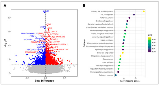 Our epigenome-wide analysis yielded 6428 DMPs (Table S3, Figure 3A) in BAL cells that were associated with HIV (FDR < 0.10). Their methylation beta difference ranged from −0.316 to 0.273 (a beta difference of 1 corresponds to 100% methylation in PLWH vs. 0% methylation in the HIV-uninfected group while a beta difference of −1 corresponds to 0% methylation in PLWH vs. 100% methylation in the HIV-uninfected group). Table 3 shows the top DMPs based on two criteria: smallest FDR and largest beta difference effect size. The 6428 DMPs associated with HIV corresponded to 4713 DMGs. The top differentially methylated genes that corresponded to the DMPs with highest statistical significance included DHX32, CPN2, FUBP1, RGL3, and OTOG. The DMPs with the largest effect sizes corresponded to ABCB11, MYOM2, PARP12, and 7SK.