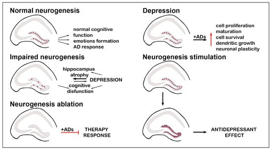 Interconnection between neurogenic processes and depression. Adult hippocampal neurogenesis is associated with emotion formation and cognitive function. Moreover, healthy adult neurogenesis is essential for response to antidepressant treatment. Impaired adult neurogenesis is associated with depression and cognitive decline. The priority of the processes is not yet clear. In the complete absence of adult neurogenesis, treatment with antidepressants is not effective. Antidepressant treatment enhances adult neurogenesis by increasing cell proliferation, maturation, and survival. The stimulation of adult neurogenesis leads to an antidepressant effect.