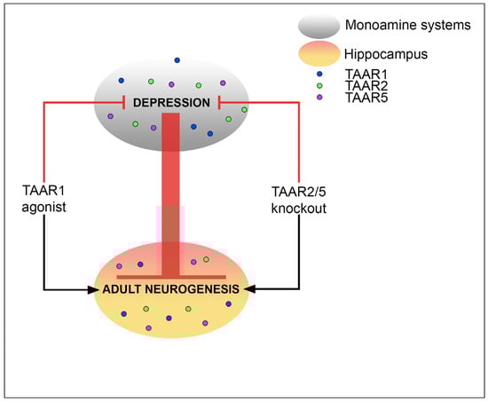 TAARs in depression and adult hippocampal neurogenesis. The pathogenesis of depression is closely related to the monoamine systems of the brain. TAAR1, TAAR2, and TAAR5 were found in the monoamine nuclei of the brain and in the hippocampus, the center of neurogenesis. Depression inhibits adult neurogenesis. TAAR1 agonists have an antidepressant effect and promote neurogenesis. TAAR2 and TAAR5 knockout animals exhibit decreased depressive-like behavior and increased adult neurogenesis.