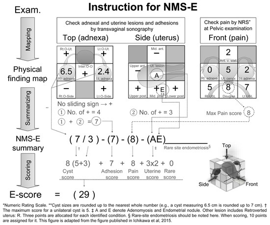 - Ichikawa, M.; Akira, S.; Sekine, M.; Ono, S.; Mine, K.; Takeshita, T. Shinbu shikyuu naimakushou jutsuzen shindan no yoake NMS-E: Numerical Multi-scoring System of Endometriosis (Surgical Treatment of Deep Infiltrating Endometriosis: The Dawn of Preoperative Diagnosis for Deep Infiltrating Endometriosis–NMS-E; Numerical Multi-scoring System of Endometriosis). J. Jpn. Soc. Endometr. 2015, 36, 77–81. [Google Scholar]