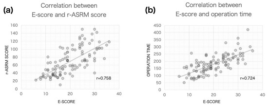 An analysis of the correlation of the E-score with the r-ASRM score and operation time. (a) This figure illustrates the correlation between the E-score and the r-ASRM score. (b) This figure shows the correlation between the E-score and operation time. Both figures are based on data from 111 subjects. The diagonal line in each graph represents the regression line.