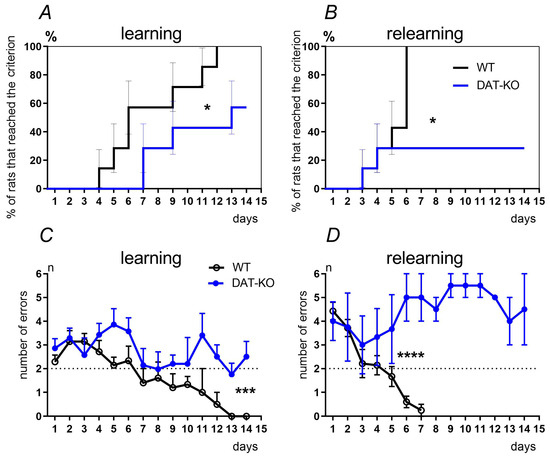 - Kurzina, N.P.; Aristova, I.Y.; Volnova, A.B.; Gainetdinov, R.R. Deficit in Working Memory and Abnormal Behavioral Tactics in Dopamine Transporter Knockout Rats during Training in the 8-Arm Maze. Behav. Brain Res. 2020, 390, 112642. [Google Scholar] [CrossRef]