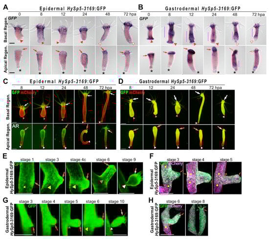 Regarding GFP fluorescence, it can be detected during apical regeneration at high levels in both epithelial layers at 8, 12 and 24 hpa, extending along the AR half, except in the peduncle region (Figure 2C,D and Figure S6A,C). Subsequently, as the tentacle rudiments appear, epidermal GFP fluorescence becomes maximal in the apical region, while gastrodermal GFP fluorescence disappears from the tip of the forming head and becomes predominant in the tentacle ring and upper body column, resembling the homeostatic pattern. As expected, in epidermal HySp5-3169:GFP animals regenerating their basal half, no GFP fluorescence is observed, except in the apical region of origin (Figure 2C and Figure S6B); in gastrodermal HySp5-3169:GFP animals, GFP fluorescence is widely distributed along the body axis, but excluded from the differentiating basal disc, as observed at 48 hpa (Figure 2D and Figure S6D).
