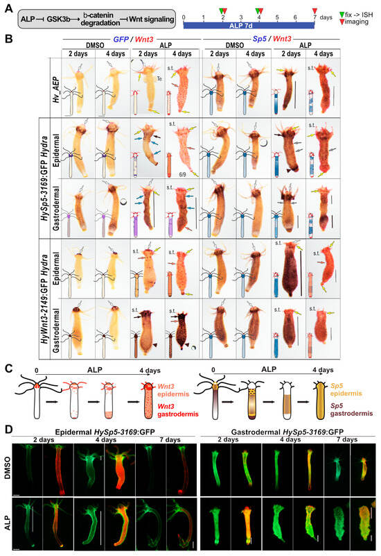 In parallel, we tested the putative layer-specific modulations of Wnt3 by exposing it to ALP animals of the epidermal and gastrodermal HyAct-1388:mCherry_HyWnt3-2149:GFP transgenic lines (named HyWnt3-2149:GFP), where GFP expression is under the control of 2149 bp of the Wnt3 promoter [27,33] (Figure S9). With regard to Wnt3 regulation after a two-day ALP treatment, the epidermal HyWnt3-2149:GFP persists at the tip of the hypostome while being strongly up-regulated in the tentacle ring and in tentacle roots, whereas small dots expressing Wnt3 and HyWnt3-2149:GFP become visible along the body column. After a four-day ALP treatment, as expected, Sp5 is strongly down-regulated, while a dense network of Wnt3 or HyWnt3-2149:GFP dots is established along the entire body column in both layers (Figure 3B and Figures S7–S9). We also noted a strong overall increase in gastrodermal HyWnt3-2149:GFP expression along the body column, indicating that the transactivation driven by the HyWnt3-2149 promoter in the gastrodermis is much greater than that driven by the full set of regulatory sequences of the endogenous HyWnt3 gene.