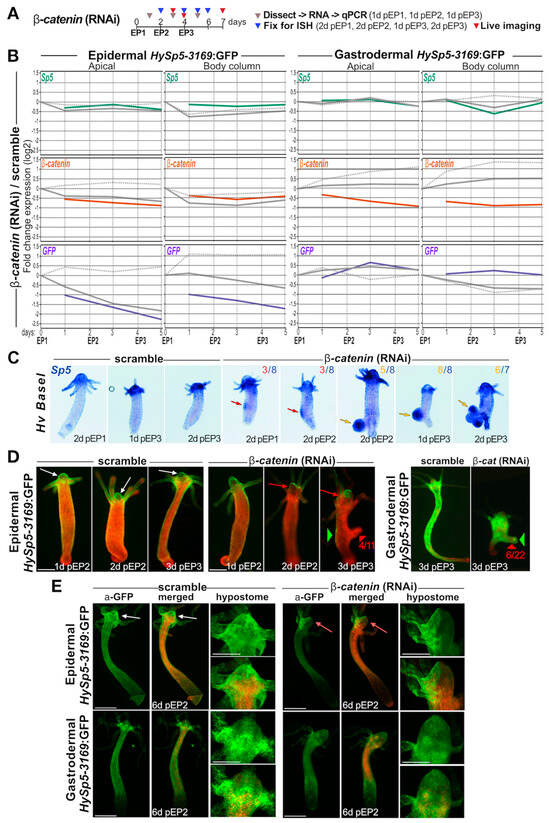 In summary, the β-catenin RNAi procedure efficiently reduces the level of β-catenin transcripts, up to twofold in both the epidermis (mainly apical) and the gastrodermis (apical and body column). This β-catenin reduction does not affect the levels of Sp5 transcripts outside the −1.41/+ 1.41-fold range (except at one time-point in the gastrodermal body column). Notably, it strongly affects the HySp5-3169:GFP transcript levels in the epidermis where a two-to-four-fold reduction (apical and body column) is noted. Such an effect is not observed in the gastrodermis. Finally, we noted that the RNAi procedure produces an EP-induced stress response in the body column leading to an unspecific increase in β-catenin levels in the gastrodermis and in HySp5-3169:GFP levels in the epidermis.