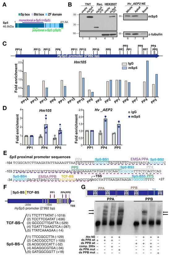 The Hydra Sp5 transcription factor belongs to the Sp/KLF family, a class of DNA-binding proteins that bind GC-rich boxes or GT/CACC elements through their three zinc finger (ZF) domains [32,44]. We previously identified, by ChIP-seq analysis performed with extracts from HEK293T cells, five Sp5-binding sites (Sp5-BS) and five TCF-binding sites (TCF-BS) within 2966 bp of the Sp5 promoter, clustered in two adjacent regions named PPA and PPB in the vicinity of the Sp5 transcriptional start site [33]. To identify active Sp5-binding sites (Sp5-BS) in Hydra Sp5 promoter sequences, we raised antibodies against the Hydra Sp5 protein with the aim of performing a ChIP-qPCR analysis of the HySp5 promoter using Hydra extracts and comparing Sp5-binding sites with those previously identified in human cells expressing HySp5. We raised two antibodies against HySp5, one monoclonal and the other polyclonal, designed to target regions that do not contain evolutionarily conserved domains present in HySp5, such as the Sp box, the Buttonhead box and the ZF DNA-binding domain (Figure 6A and Figure S18A). The two Sp5 antibodies specifically recognize the HySp5 protein, either as the HySp5-218 recombinant protein (24.5 kDA) used to raise the Sp5 monoclonal antibody, produced full length in vitro with the TNT reticulocyte transcription-coupled-translation system or expressed in transfected HEK293T cells (Figure 6B and Figure S18B,C).