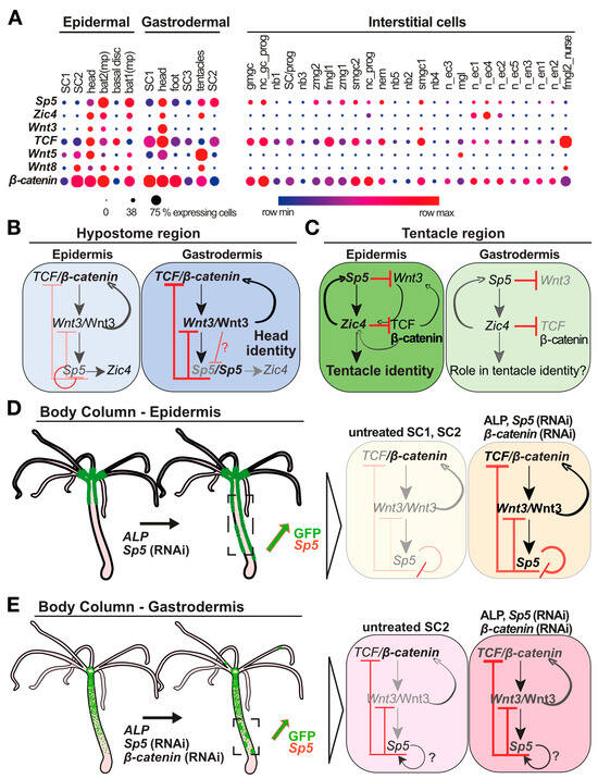 Pharmacological and genetic manipulations have shown that dynamic interactions between Wnt/β-catenin, Sp5 and Zic4 play a crucial role for apical development and the maintenance of apical patterning [33,34]. However, although Wnt3 is predominantly expressed in the gastrodermis, the specific role of each epithelial layer in the formation and maintenance of the head organizer remains unknown. The aim of this study is to uncover the dynamics of the Wnt/β-catenin/Sp5/Zic4 gene regulatory network in the epidermis and gastrodermis. To test these regulations in homeostatic and developmental contexts, we generated two transgenic lines that constitutively express the HyAct-1388:mCherry_HySp5-3169:GFP reporter construct in either epithelial layer. We monitored mCherry and GFP fluorescence in parallel with the detection of GFP, Sp5, Wnt3 expression in intact, budding or regenerating animals, as well as in animals where Wnt/β-catenin signaling is either stimulated or knocked-down. In each of these contexts, we recorded distinct regulations of Sp5 in the epidermis and gastrodermis, notably an epidermal-specific negative autoregulation of Sp5 in the body column. These results point to distinct architectures of the Wnt/β-catenin/Sp5/Zic4 gene regulatory networks active in the epidermis and the gastrodermis, and we discuss their respective roles in the regulation and activity of the head organizer.
