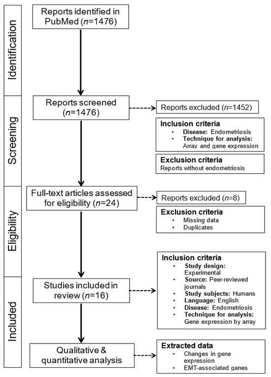 PRISMA flowchart of the literature search and data selection. This systematic retrospective review is based on literature research conducted in PubMed. The main focus was on mRNA/cDNA array analysis, EMT, and endometriosis in the eutopic and ectopic endometrium. These reports were carefully read, and data were extracted.
