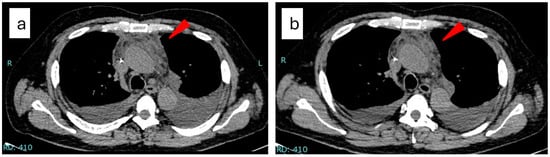 A man in his sixties presented with thrombocytopenia, pleural effusion, ascites, fever, renal insufficiency, and mild splenomegaly. The patient exhibited no enlarged superficial lymph nodes. A bone marrow biopsy showed reticulin fibrosis and megakaryocyte hyperplasia, which are compatible with the findings of TAFRO syndrome. A random skin biopsy was negative for intravascular large B-cell lymphoma. The chest computed tomography demonstrated a “matted” appearance of the enlarged anterior mediastinum (a, red arrow). The lesion slightly regressed 1 week after the initiation of the treatment with 1 mg/kg of prednisolone (b, red arrow).