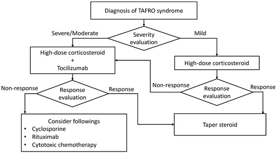 Our current treatment algorithm for patients with TAFRO syndrome. Disease severity is evaluated according to the 2019 updated diagnostic criteria and disease severity classification for TAFRO syndrome.