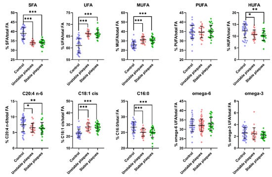 The impact of the formation of plaques on the levels of fatty acids in the blood plasma. The data presented here represent the means of normalized percentages of a parameter ± S.D. Statistically significant differences are indicated by * (p < 0.025), ** (p < 0.005), and *** (p < 0.0005), which were evaluated by ANOVA.