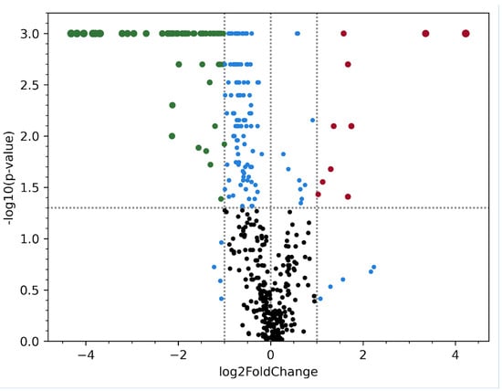 Volcano plot of lipidomics illustrating compounds differing between the patients with BCA and healthy control groups. Each dot represents 1 of 453 compounds. The x-axis represents log2 (Fold change), and the y-axis represents −1og10 (p-value). The two lines parallel to the y-axis are x = −1 and x = 1. The points to the left of x = −1 and to the right of x = 1 are compounds with differences > two-fold. The line parallel to the x-axis is y = 1.30. Red points represent 10 lipid compounds upregulated significantly in BCA group, based on fold-change > 2 and p < 0.05 (Mann–Whitney U test). Green points represent 72 lipid compounds downregulated significantly in BCA group based on same criteria. Blue dots represent metabolites for which the change in abundance between experimental groups is not significant according to one of the significance criteria. Black dots represent lipids with no significant differences.