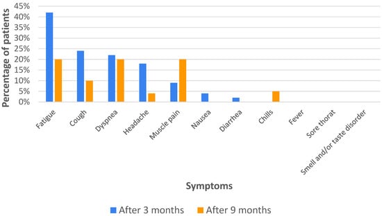 At the second follow-up visit, 9 months after hospital discharge, only 35% of the patients reported persistent symptoms, with only 15% reporting simultaneous occurrence of three or more symptoms. Among the most frequently reported symptoms were, as before, fatigue, followed by dyspnea and myalgia (each 20%); chronic cough persisted in 10% of the patients, while headache and chills occurred in 5% of the respondents, respectively (Figure 1).