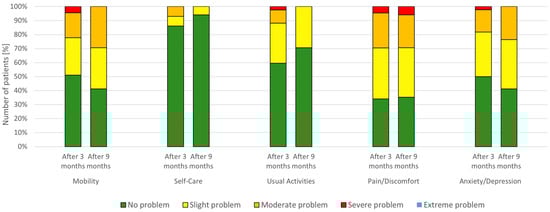 Similarly to the results obtained after 3 months, the most frequently affected domain was that of pain/discomfort (65% of the patients), followed by the domains of mobility and anxiety/depression (both 59%). The domain of usual activities was impaired in 29% of the patients. As previously, the least affected domain was self-care (only 6% of the recovered patients)—Table 3, Figure 2. No significant differences in the level of HRQoL impairment in specific domains were observed between the 3-month and 9-month follow-ups.