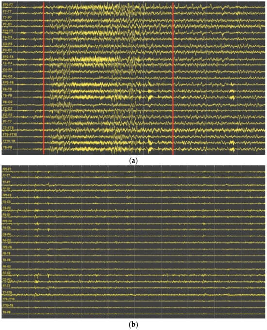 CHB01_03 file with seizure and non-seizure signals. (a) shows abnormal electrical activity in the brain, consistent with a seizure. The figure shows a spike and wave pattern, which is a characteristic of a seizure. The spike and wave patterns are caused by abnormal synchronization of electrical activity in the brain. This synchronization can lead to a seizure, which is a sudden burst of electrical activity in the brain that can cause a variety of symptoms, including loss of consciousness, convulsions, and sensory disturbances. The red lines correspond to the windows used. (b) shows normal electrical activity in the brain. The figure does not show any spike and wave patterns, which is consistent with normal brain activity. Normal brain activity is characterized by a variety of different electrical patterns, including alpha waves, beta waves, theta waves, and delta waves. These waves are associated with different levels of consciousness and brain activity. For example, alpha waves are associated with a relaxed state of wakefulness, while beta waves are associated with a state of alertness.
