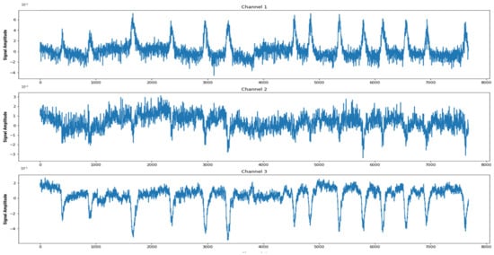 The Siena Scalp EEG (SSE-EEG) database [53] consists of EEG recordings of fourteen patients with epilepsy, including nine males (ages 25–71) and five females (ages 20–58). The recordings were collected with a video-EEG with a sampling rate of 512 Hz using electrodes arranged according to the international 10–20 system. The data were acquired using reusable silver/gold cup electrodes and EB Neuro and Natus Quantum LTM amplifiers. The database includes 14 folders containing EEG recordings in EDF format, with each subject having between one and five data files and a text file containing information on data and seizures. The files contained signals recorded on the same or different days, and the seizure events were chronologically ordered. The database contains 47 seizures in approximately 128 recording hours, with seizure durations ranging from a few seconds to a few minutes. The database also includes information on the number of EEG channels, which varies for each subject. Figure 3 displays the signal of the first three channels as a sample from the thirty-four channels.