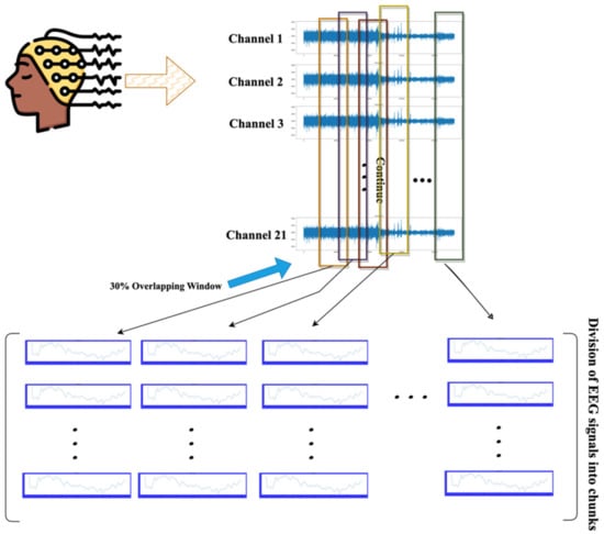 The preprocessing of EEG raw signals involves transforming the continuous signal into smaller segments or windows, known as chunks. To achieve this, a windowing technique with a defined window size and overlapping ratio was applied to the CHB MIT and Siena Scalp EEG datasets [52,53]. After reading each file from the directory a 30 s window with 30% overlap was applied to the multichannel EEG raw signal. This means that each window contains 30 s of data, and the next window will start with 30% of the previous window. This technique is used to capture the temporal information of the signal while reducing the impact of windowing artifacts. Figure 4 shows the division of EEG signals into chunks of 30 s with a 30% overlapping window. A 30% overlapping ratio ensures that the signal chunks retain continuity, thereby reducing the likelihood of information loss at the edges of the windows.